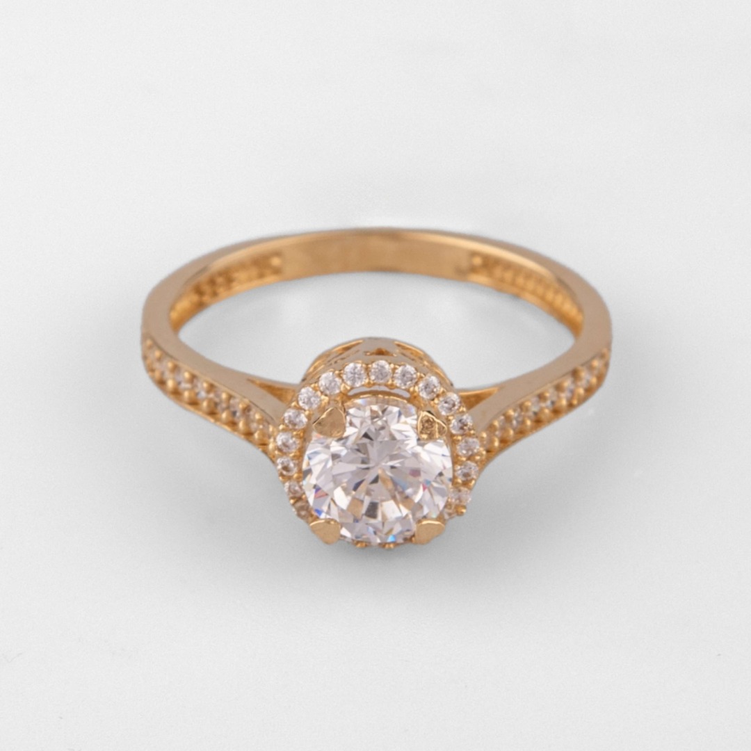 Δαχτυλίδι μονόπετρο με ροζέτα κατασκευασμένο από χρυσό 14 καρατίων διακοσμημένο με κρύσταλλα ζιρκόν λευκής απόχρωσης.