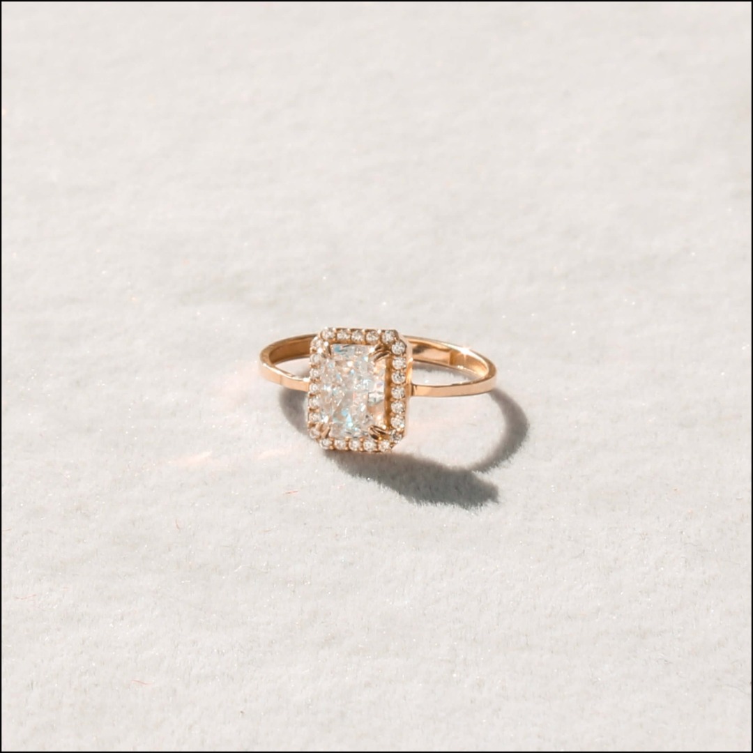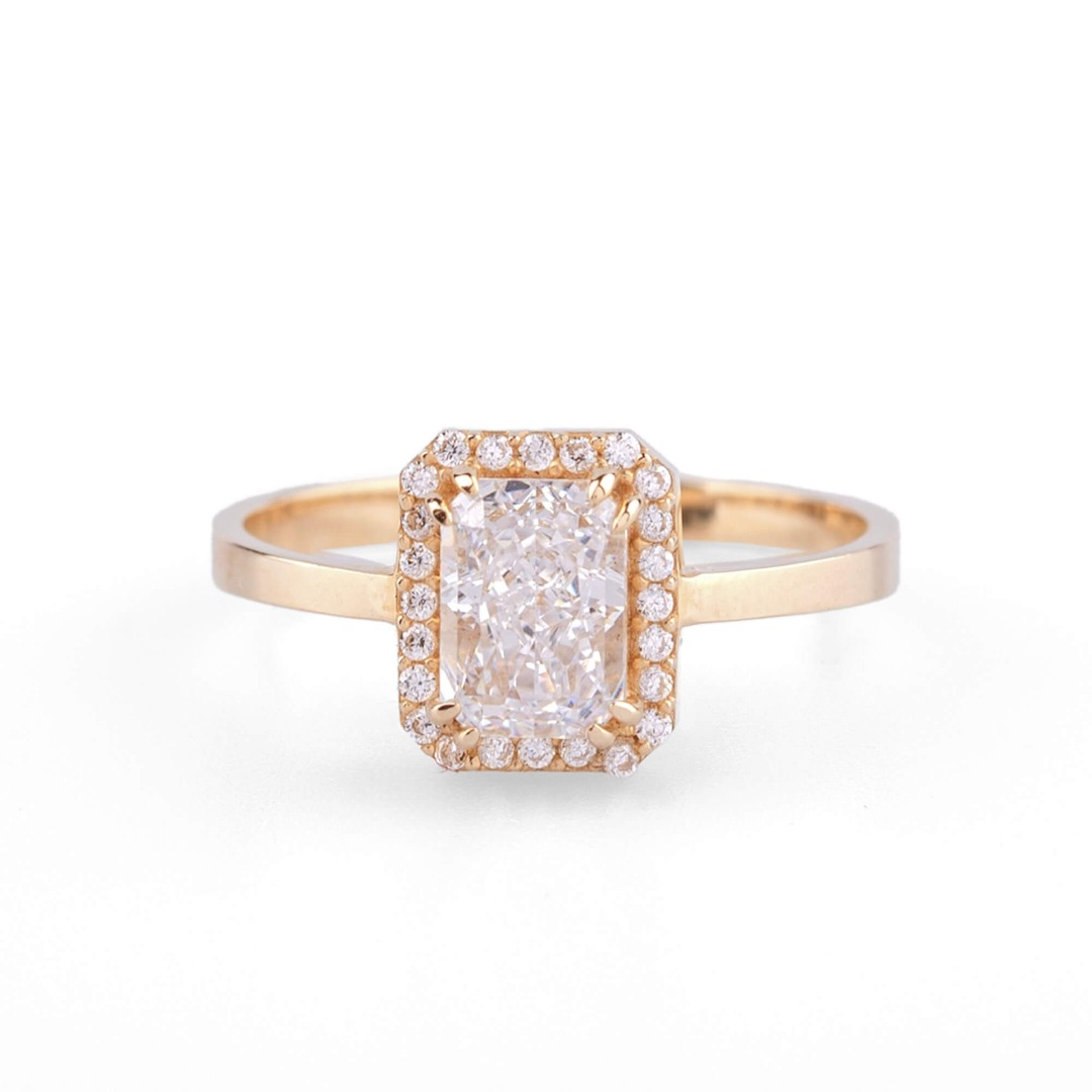 Δαχτυλίδι ροζέτας κατασκευασμένο από χρυσό 14 καρατίων διακοσμημένο με κρύσταλλα premium zircon σε κοπή radiant λευκής απόχρωσης στην κεντρική θέση και σε κοπή round brilliant λευκής απόχρωσης στο στεφάνι.