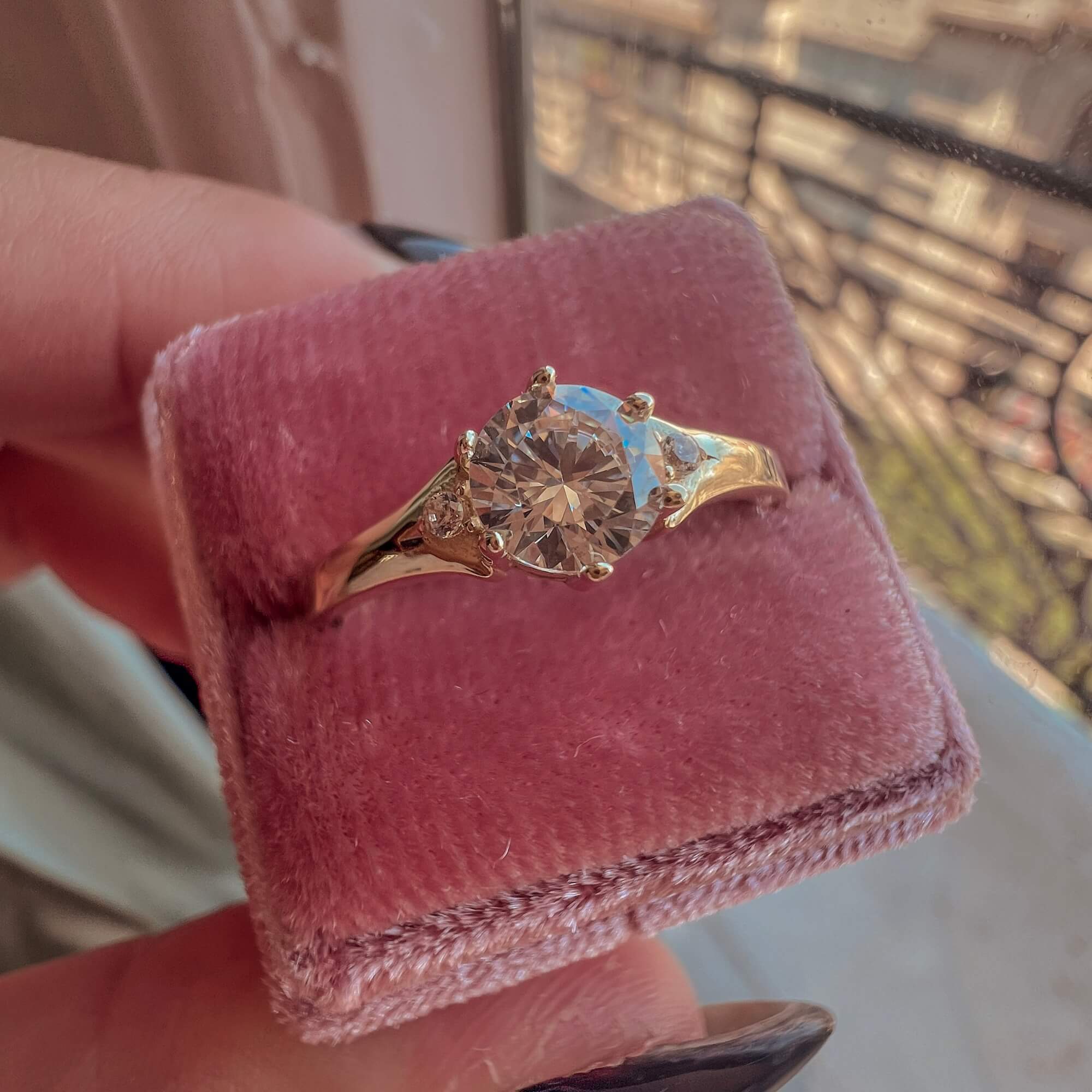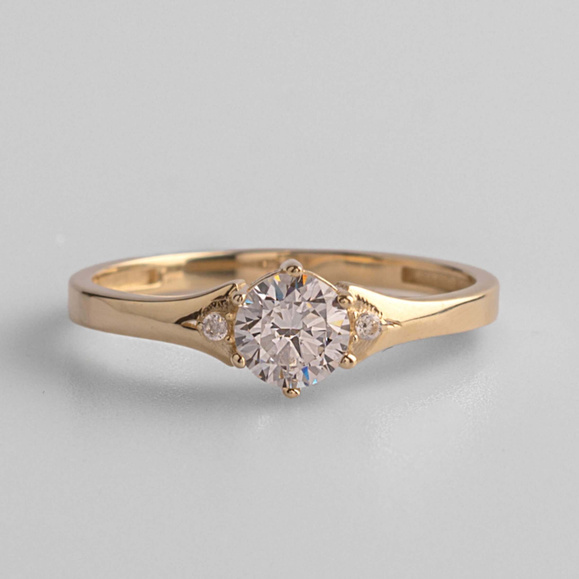Δαχτυλίδι μονόπετρο κατασκευασμένο από χρυσό 9 καρατίων διακοσμημένο με synthetic cubic zirconia σε κοπή round brilliant στην κεντρική θέση και στις πλευρικές θέσεις.