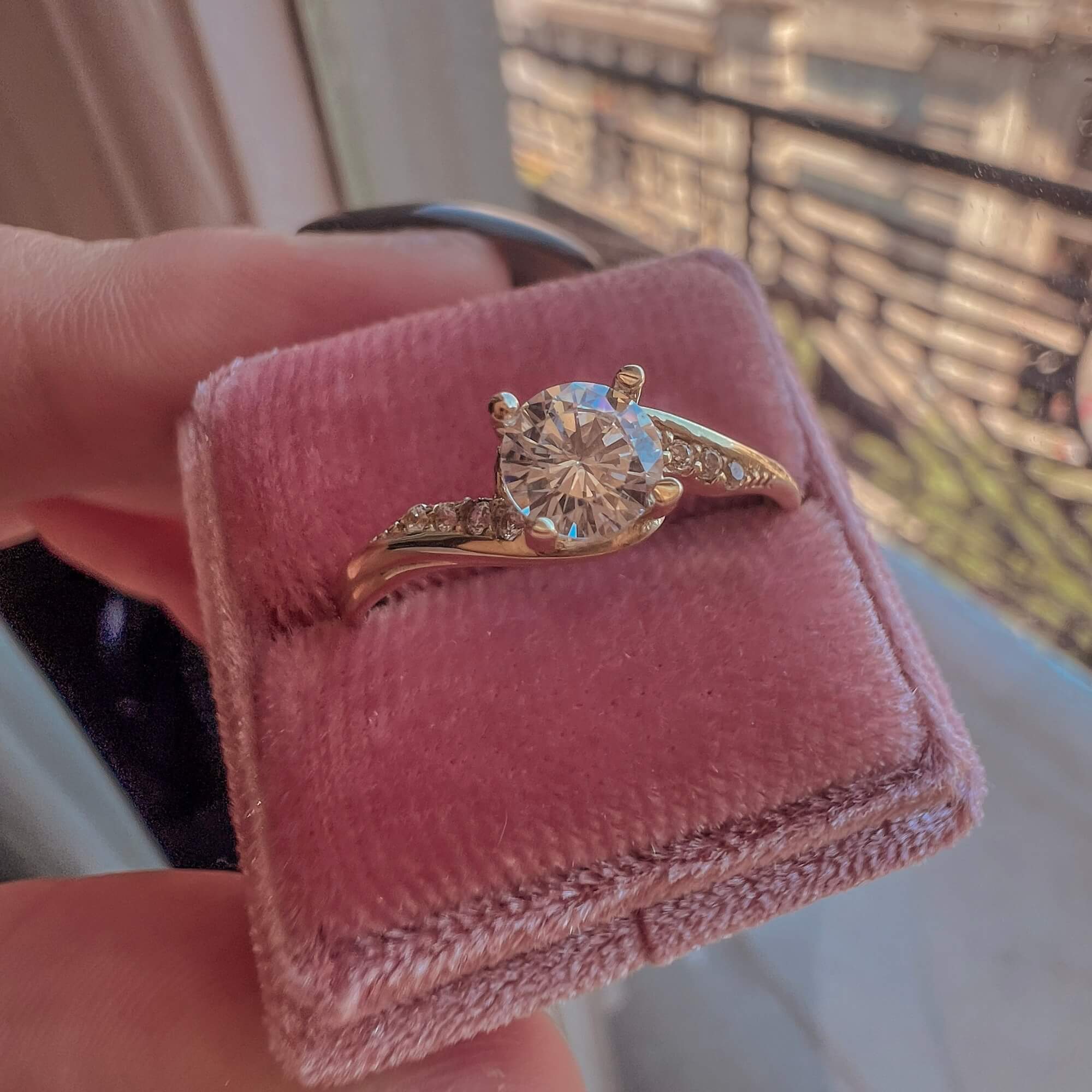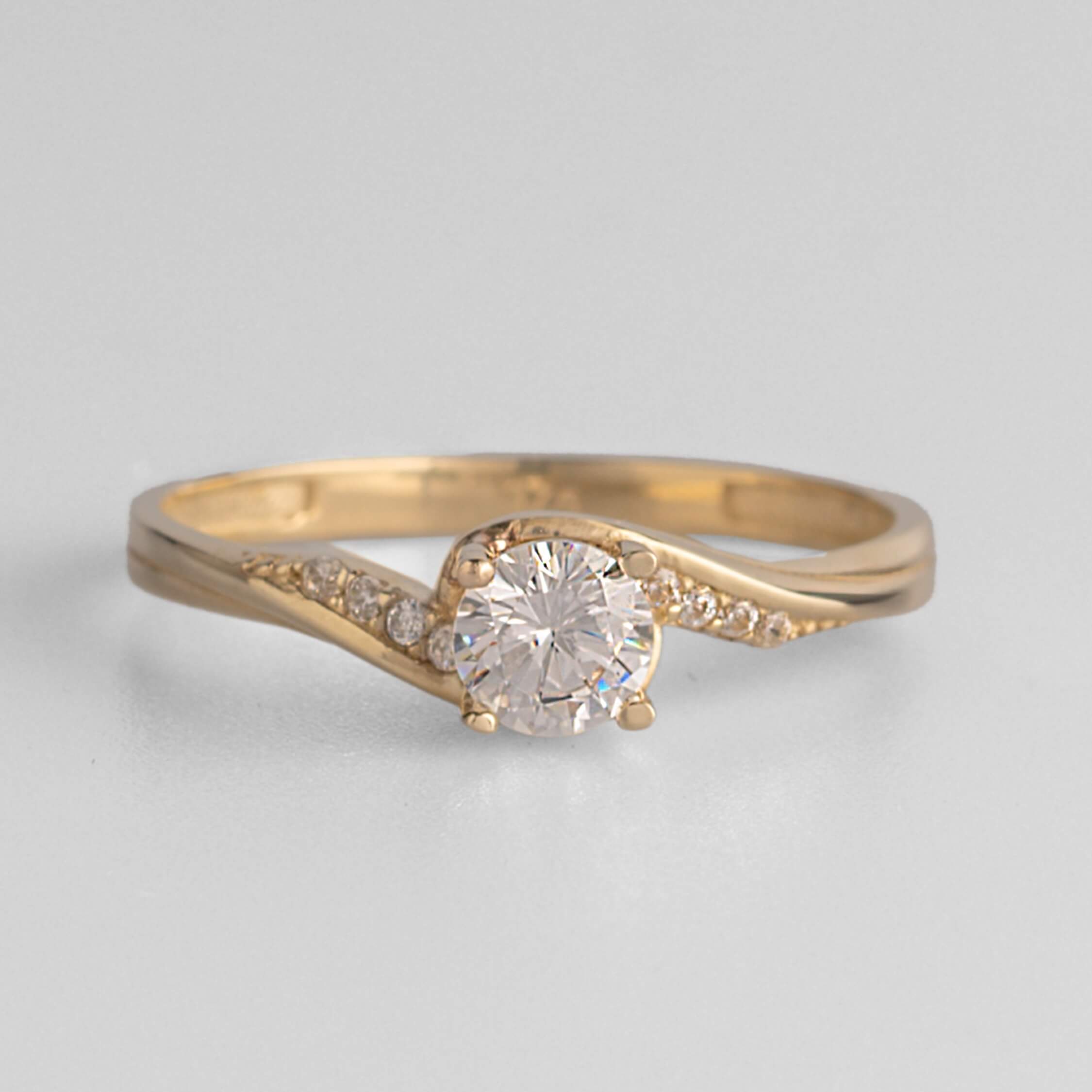 Δαχτυλίδι μονόπετρο κατασκευασμένο από χρυσό 9 καρατίων διακοσμημένο με synthetic cubic zirconia σε κοπή round brilliant στην κεντρική θέση και στις πλευρικές θέσεις.